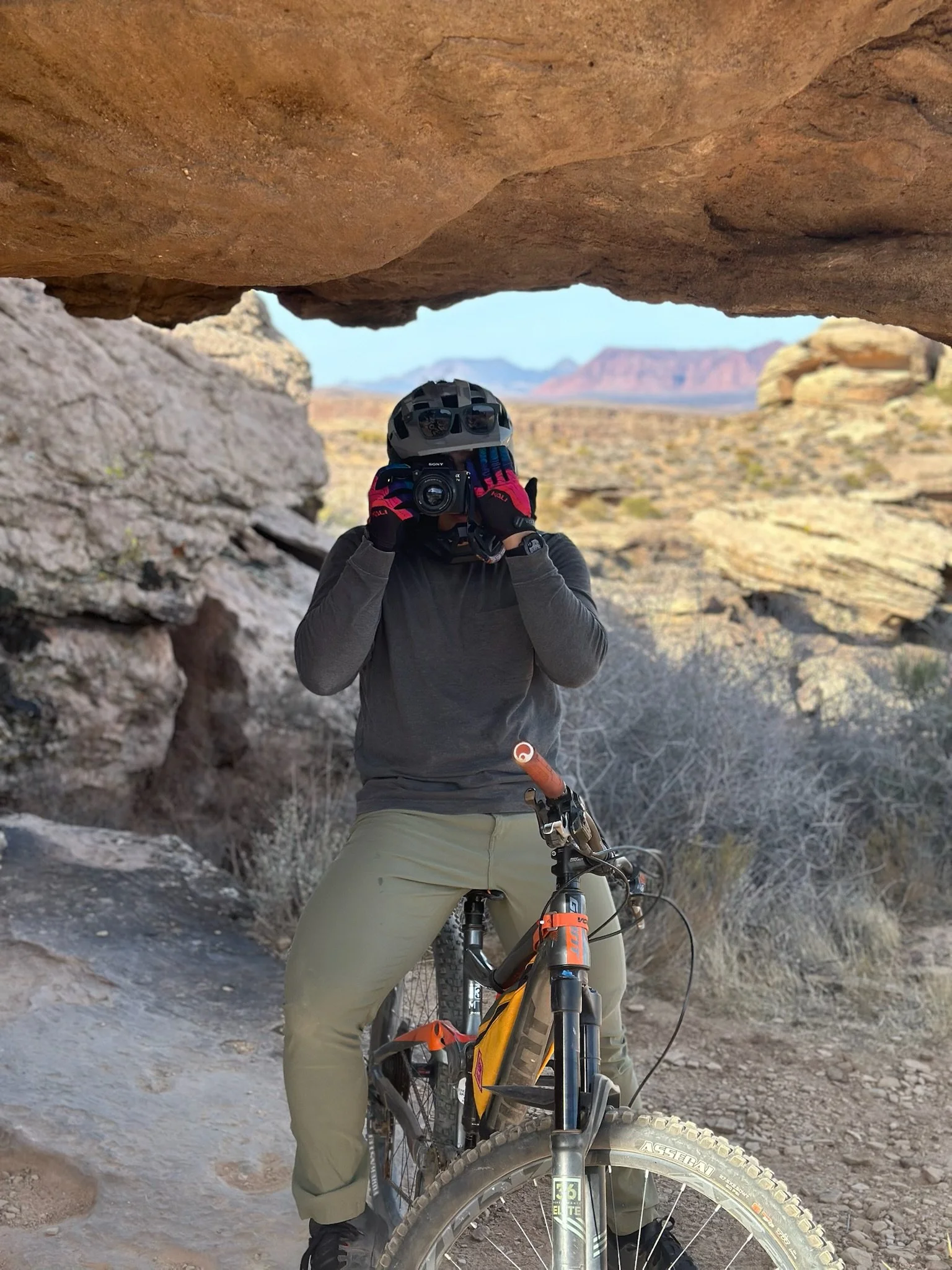The main disadvantage to bag option is that my cameras were always put away. I had to stop and dismount my bike in order to capture friends ripping down trails before and after me. It felt embarrassing since I hate stopping friends on a good ride just so I can get a shot. This would in turn cause my friends to say “ditch the bag, just ride”. Knowing that this St. George trip was on the horizon, I was determined to test new ways to ride with camera.